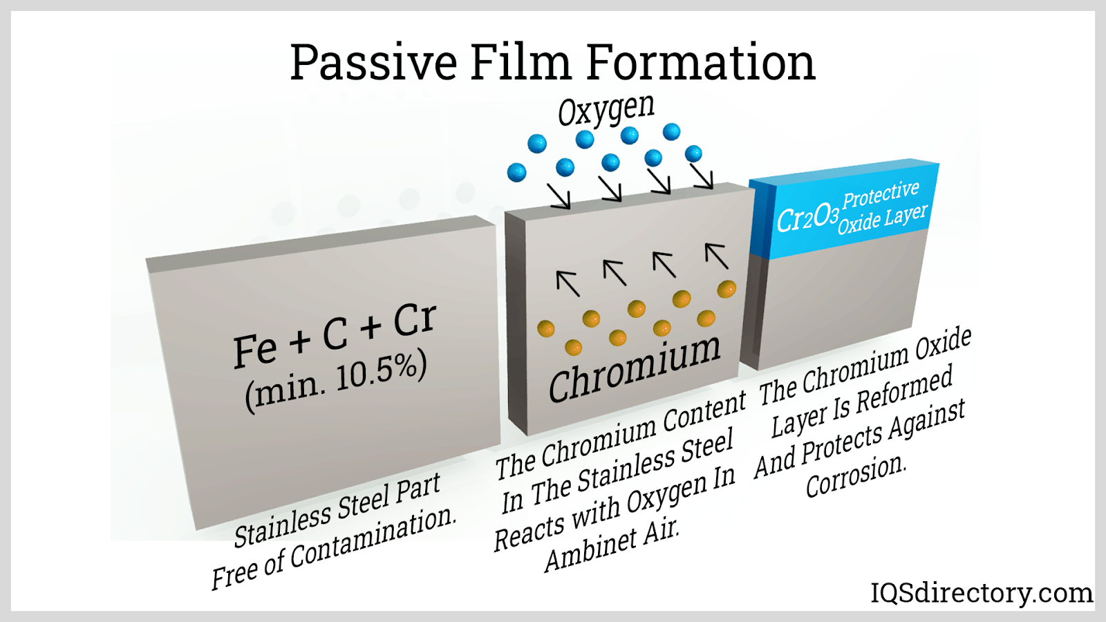 Stainless steel benefits significantly from passivation, a process that makes the metal "passive" or resistant to oxidation in corrosive environments and process fluids. This is accomplished by exposing the stainless steel to air, allowing the formation of a protective layer of chromium oxides on its surface.