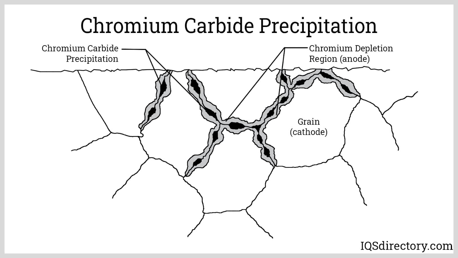 Carbon: This is the main alloying element of steel. Iron alone has poor mechanical properties, but when alloyed with varying amounts of carbon imparts a wide range of hardness and strength. Adding carbon makes the steel harder and stronger but more brittle. Decreasing it improves ductility. Also, adding sufficient amounts of carbon allows the steel to respond to heat treatment. However, there is a certain limit to how much carbon can be added. For austenitic stainless steels, adding too much carbon promotes sensitization. Sensitization is the precipitation of chromium carbides at the grain boundaries that consumes the chromium from the adjacent regions. This makes the stainless steel susceptible to intergranular corrosion.