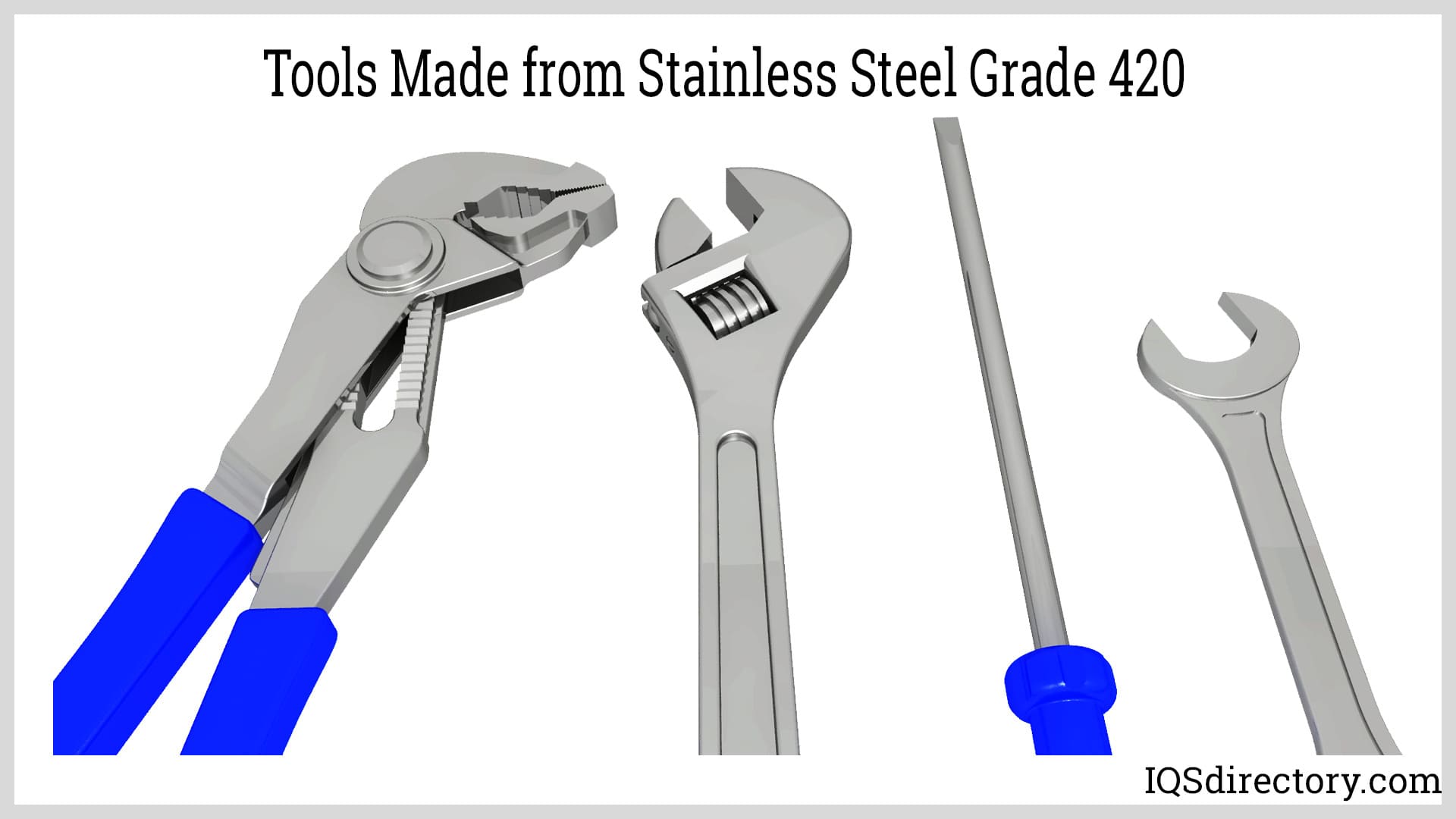Stainless steel grade 420 has many of the mechanical properties of carbon steel, which makes it ideal for the shaping and forming of tools with the mechanical characteristics of industrial tools. In some cases, grade 420 is used in place of grades 304 and 316 due to its exceptional tensile strength and hardness. Tools made using grade 420 have a longer useful life due to the metal's high wear resistance.