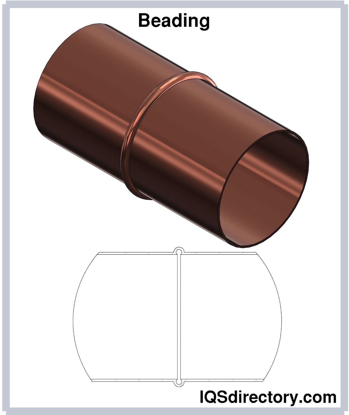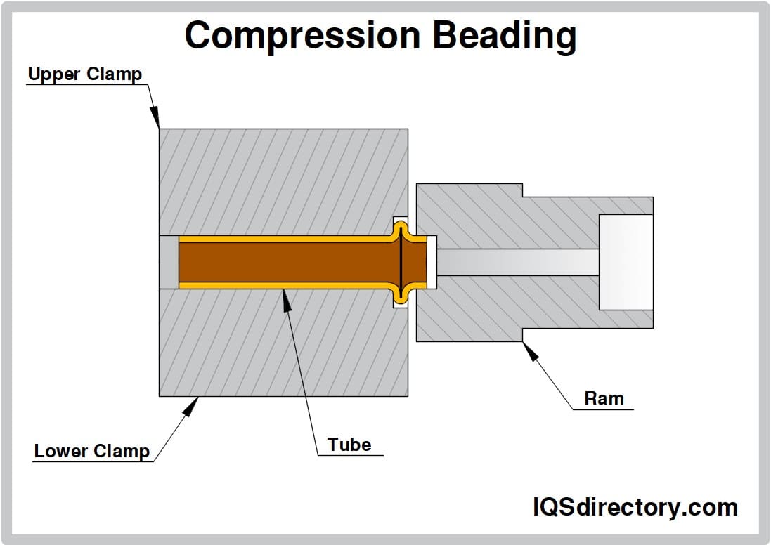 During the beading operation on a ram forming machine, the tube is held securely in a clamped fixture with a gap between clamp halves. Special channels in these clamps allow for beading as both sides compress axially towards each other, forming a robust bead. When this process is executed using ram-type end forming machines, it is called compression beading.