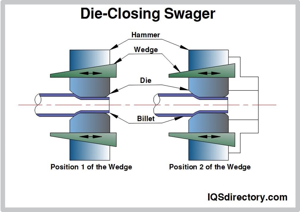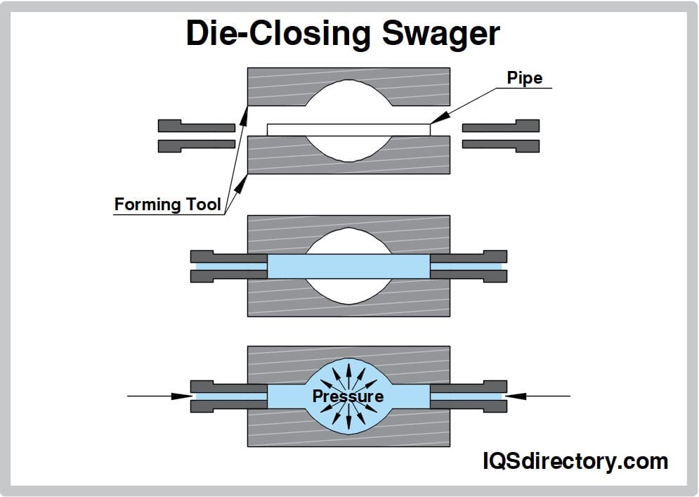 In die-closing swagers, a segment of the tube to be swaged is inserted through a set of closed reciprocating dies before the swager begins rotating. The wedges then advance to compress the dies. A radial compressive force is applied each time the die strikes the tube for a set duration. After the swaging process is complete, the dies retract, and the swaged part is removed.