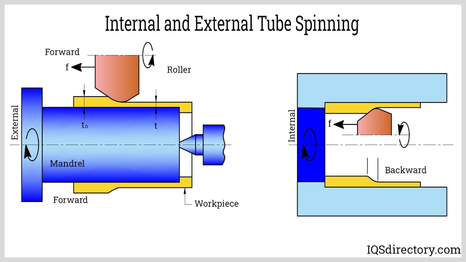 Tube spinning, a form of precision flow forming, stretches and elongates tubing to alter its wall thickness and mechanical characteristics. During tube spinning, the tube is mounted over a mandrel and drawn along its axis by synchronized rollers positioned around its circumference. The process may be performed externally—stretching the tube over a solid mandrel—or internally, spinning tubing within a hollow mandrel. Tube spinning is frequently utilized in the aerospace and energy sectors to manufacture seamless tubes with consistent properties and variable diameters.