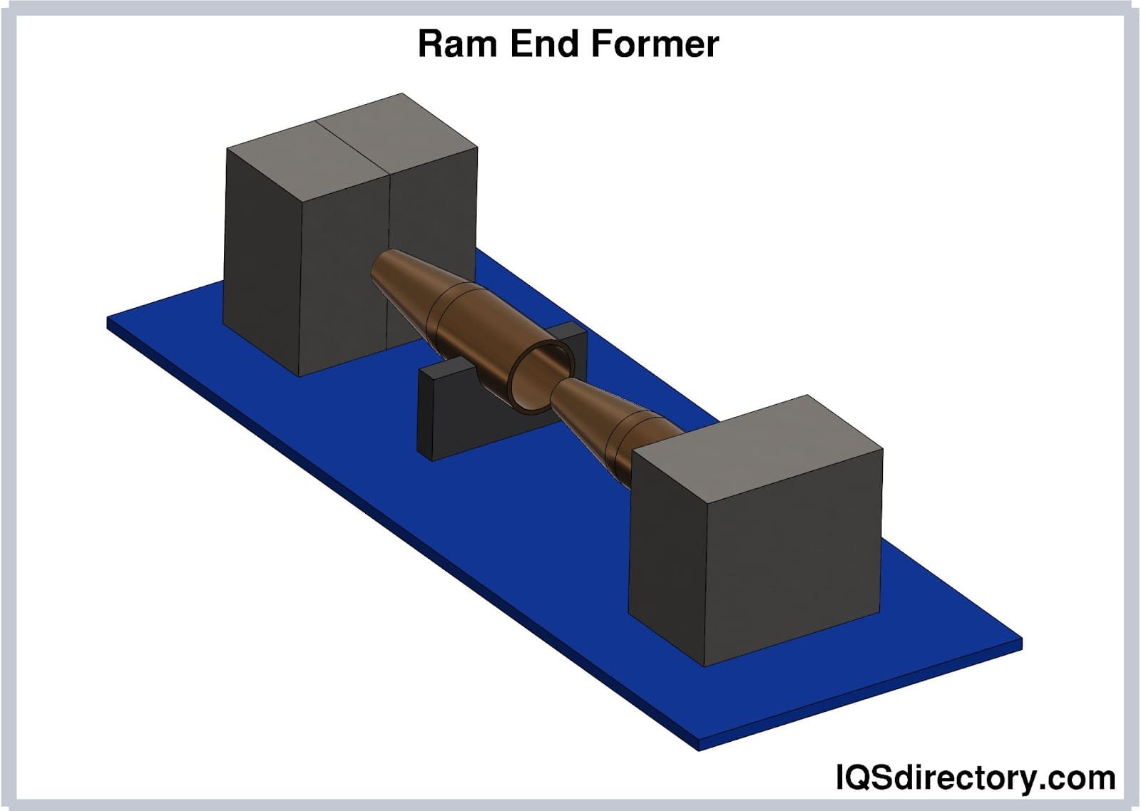 Ram end formers shape the tube end by applying controlled axial force, causing plastic deformation to achieve the desired contour or dimension. These automated or semi-automatic tube forming machines are equipped with vise jaws and a ram nose: the vise jaws clamp and support the tube for stability, while the ram nose, shaped to match the final tube end profile, strikes the end to achieve deformation. This incremental forming process, performed over several cycles with varying ram noses, results in precise end geometry with minimal distortion, making it suitable for operations requiring large expansion or reduction. High-speed production environments benefit from the repeatability and consistency of ram forming. Due to heat and friction generated, lubrication and coolant are generally applied to reduce wear and improve surface finish during each stroke.