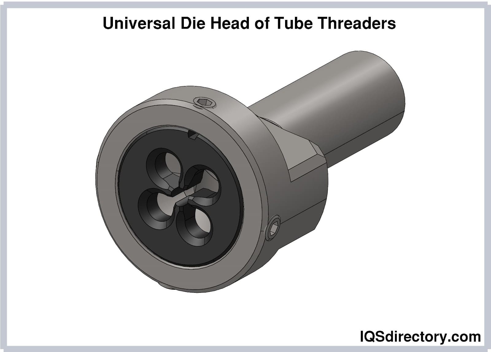 To create the thread, material is cut away from the tube end using a stationary universal die head equipped with sharp teeth. The universal die head is adjusted to match the outer diameter of the tube. Once setup is complete, the wheel rotates the tube while the universal die head is placed on the tube end. Cutting begins as the sharp teeth engage with the tube. Liquid coolant is applied to the cutting area, and the chips generated from cutting are collected on the bed of the tube threader.