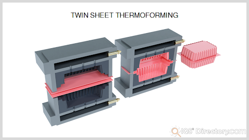 Forming stages give the three-dimensional characteristics (length, width, and height) to the once flat sheet. Forming methods may be vacuum forming, pressure forming, mechanical mold forming, and twin sheet forming. Afterwards, formed parts are trimmed from the sheet web.