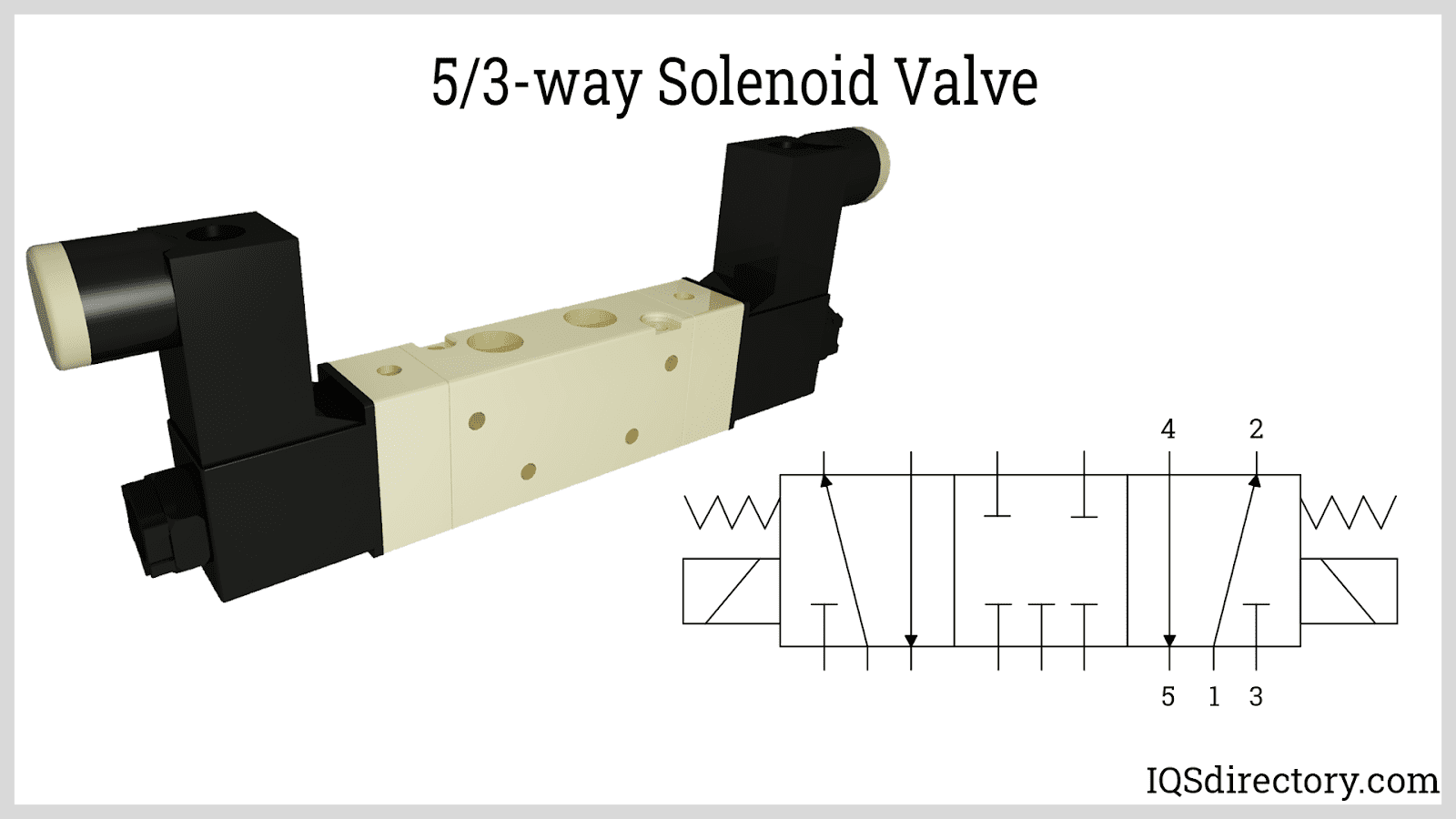 These solenoid valves are similar to standard 5/2-way valves, but they include a central position as the default state. They feature two solenoids and two spring return mechanisms to enable the actuator to return to its resting position. Various 5/3-way valves are classified based on the function of their default state. Typically, this default state is the valve's "rest" position, which maintains the actuator's position when the valve is not actively engaged.