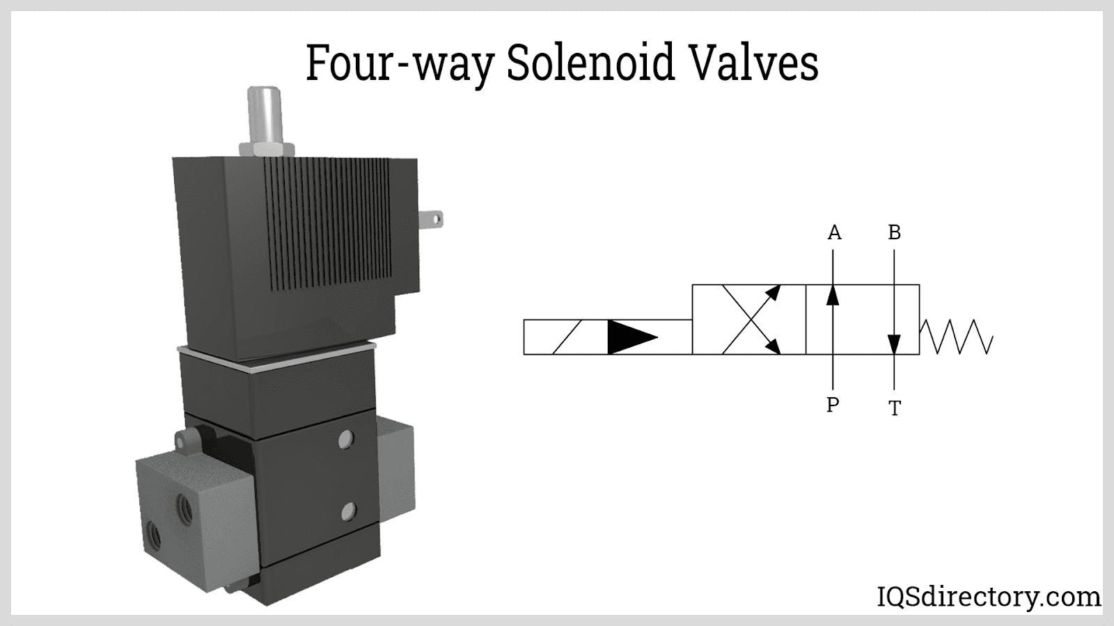 Four-way solenoid valves have four ports: an inlet (pressure port), two outlet or actuator ports, and an exhaust port. The two states of this valve allow flow from the pressure port to one of the outlet ports while venting pressure from the other port to the exhaust. There is no normally open or closed position; they mainly act as a directional control valve.