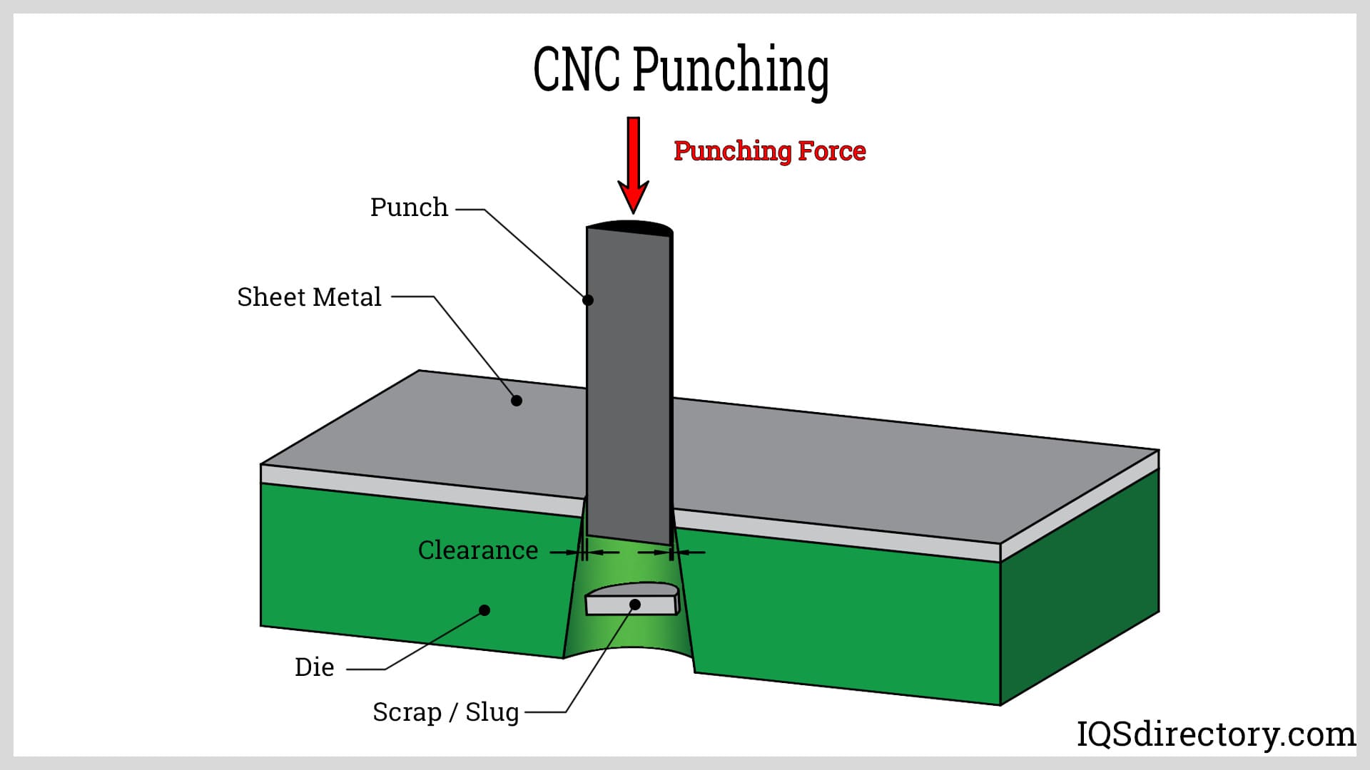 Punching is a metal stamping process that involves a punch and dies to place holes and other features in sheet metal. The punch tool is pressed against the sheet metal while the die supports the metal sheet. The created feature is the result of the force of the punch tool being pressed against the metal sheet under great force. The shearing of the metal sheet by the punch tool produces burrs along the edge of the top side of the hole, which are removed by deburring. For punching thick steel plates, maximum tonnage stamping machines are used.