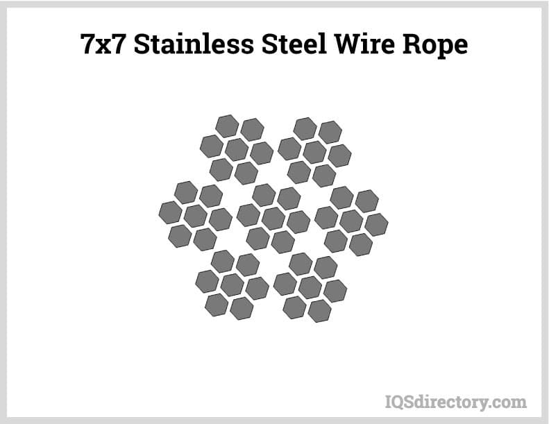One widely used example is the 7x7 stainless steel wire rope, manufactured from corrosion-resistant grade 302 stainless steel. As shown in the diagram below, this wire rope consists of seven strands with seven individual wires in each, resulting in excellent strength and moderate flexibility—ideal for rigging, winch cables, aircraft controls, and marine applications where both durability and resistance to environmental conditions are crucial.