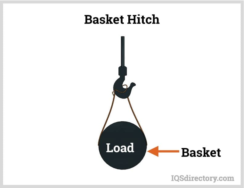 Basket Hitch: The basket hitch employs both sling eyes looped together under the load and placed over the hook, distributing the weight evenly on both sides. This method improves load security, doubles capacity, and is preferred for balancing irregularly shaped objects.