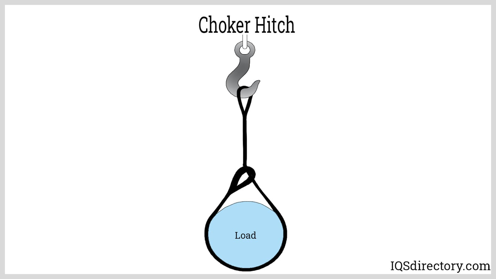 Choker Hitch: In the choker hitch, one sling eye attaches to the crane or hoist hook, while the other eye is looped back to form a choke around the load. This hitch is widely chosen for securing cylindrical loads, pipes, or bundles and is known for its ability to restrain loads that might shift during transport or lifting.