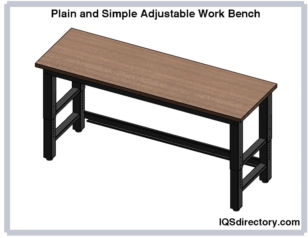 Adjustable work bench tops are made from a wide variety of materials to conform to the requirements of any application.