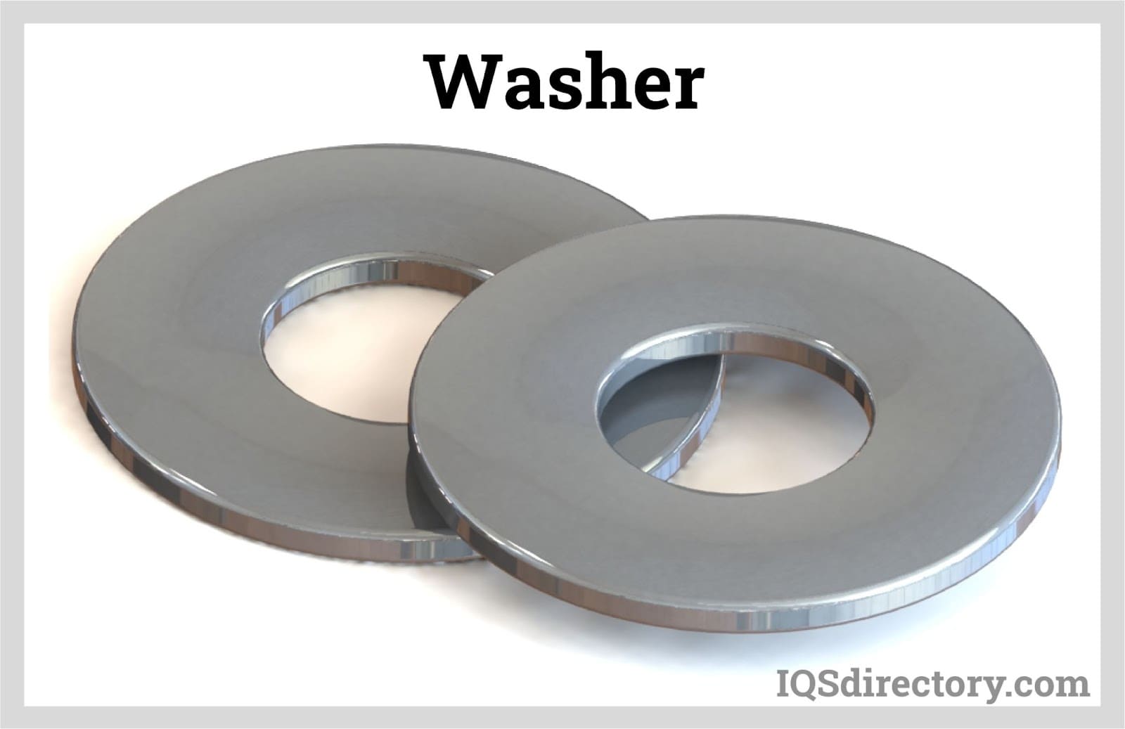 A washer, a thin plate with a concentric hole at its center placed under the bolt head and the nut to distribute the load of the threaded fastener over a larger area.