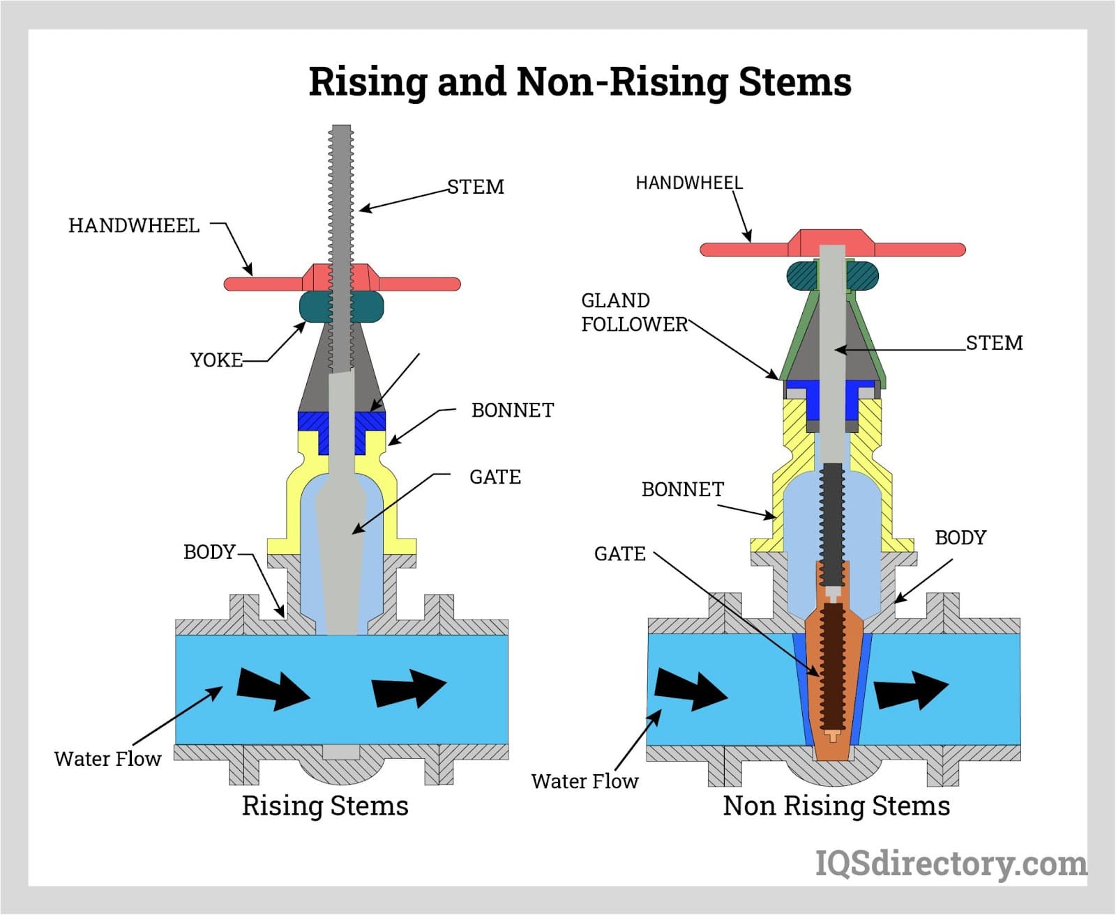 Rising stems, extend their length up to the handwheel, as the handwheel is turned the stem to open or close the valve. Non-rising stems rotate to open or close the valve without the stem move up or down.