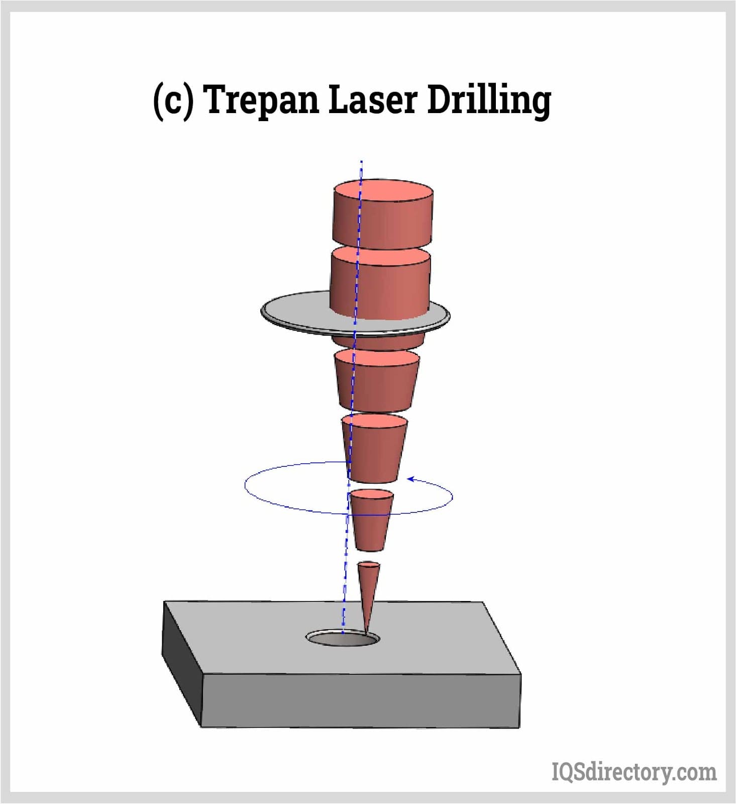 Trepan laser drilling, the laser spot size is significantly smaller than the hole size then traverses around the hole, expanding the drilled hole to the desired diameter.