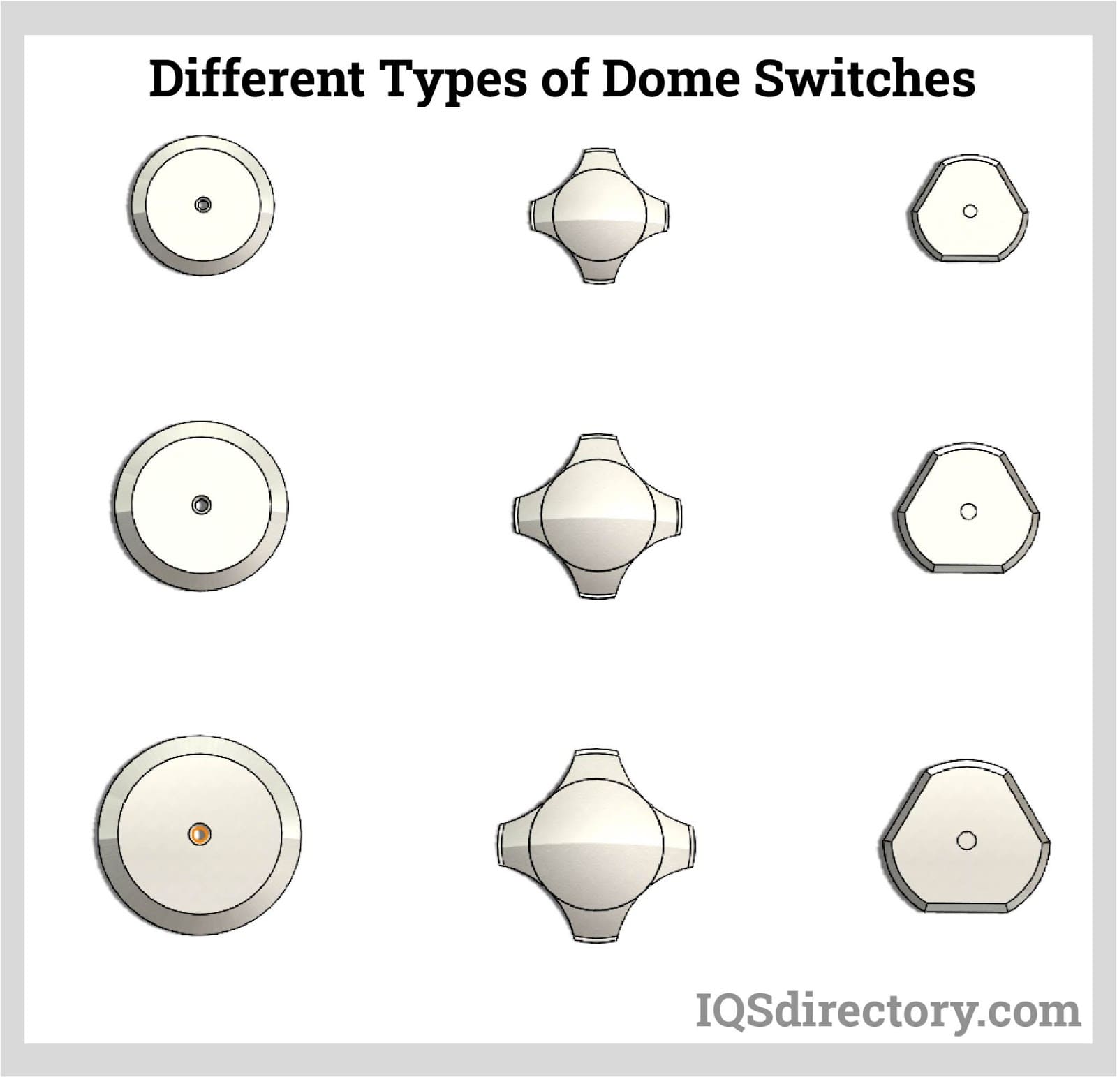 - Provide tactile feedback and complete the circuit. A dome switch offers a distinct feel when pressed. Metal domes are typically made from nickel, silver, or gold-plated stainless steel or aluminum, ensuring long-term reliability. Rubber domes are quieter and less expensive but have a lower tactile response and shorter lifespan than metal domes.