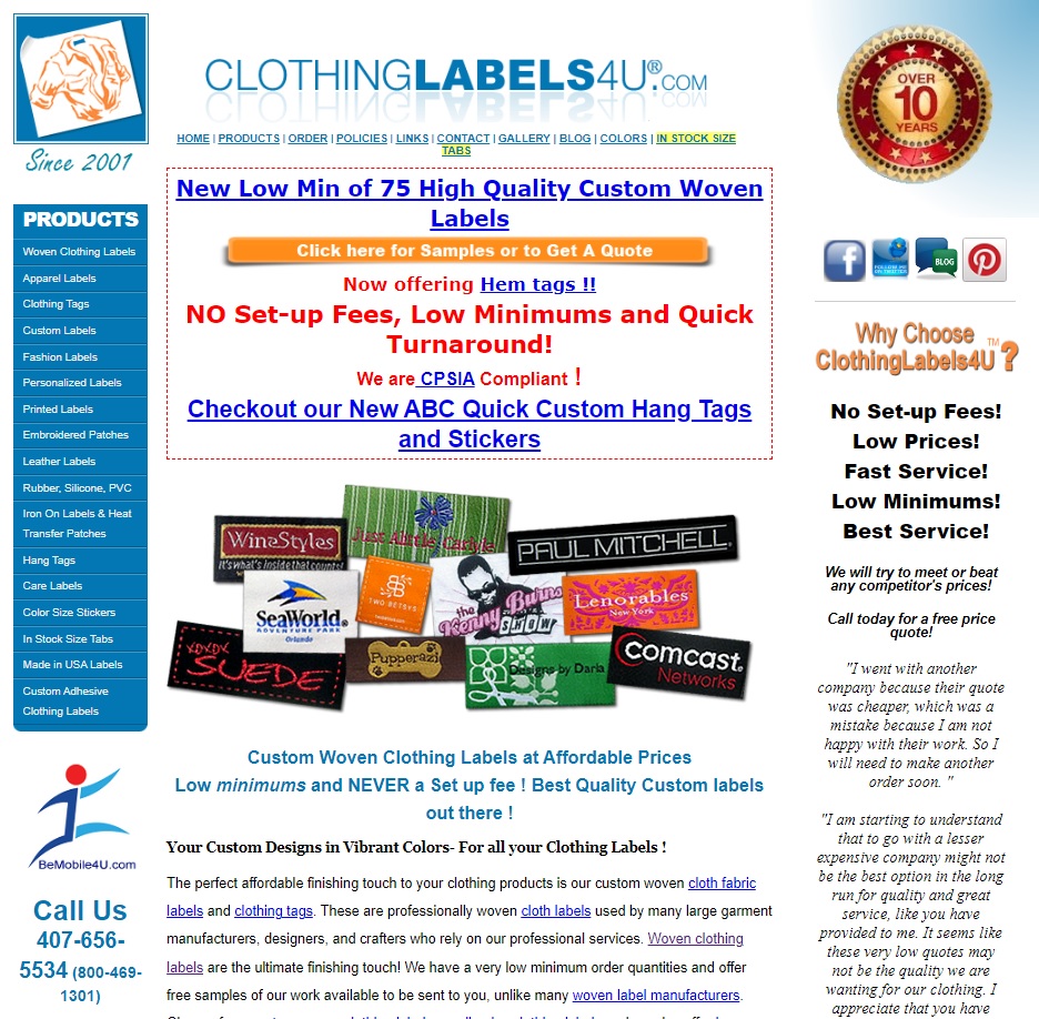For cloth labeling and branding, Clothing Labels 4U.com is the choice of many large garment manufacturers and designers. Custom sewing capabilities include various woven clothing labels, hang tags and patches customized to your fabric, logo, style and color choices. Options include tagless labels and rubber labels! Organic Cotton Printed Labels that are made here in the USA!!!
