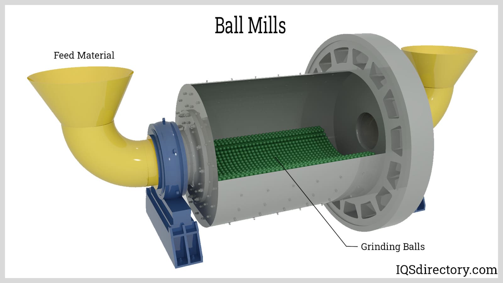 - Cylinders partially filled with a spherical grinding medium used to grind material. A ball mill is constructed from a rotating cylinder that is mounted horizontally. They use grinding media such as steel balls or rods, which, as the cylinder turns, are tossed around the cylinder, smashing into the material to be grinded as they do so.