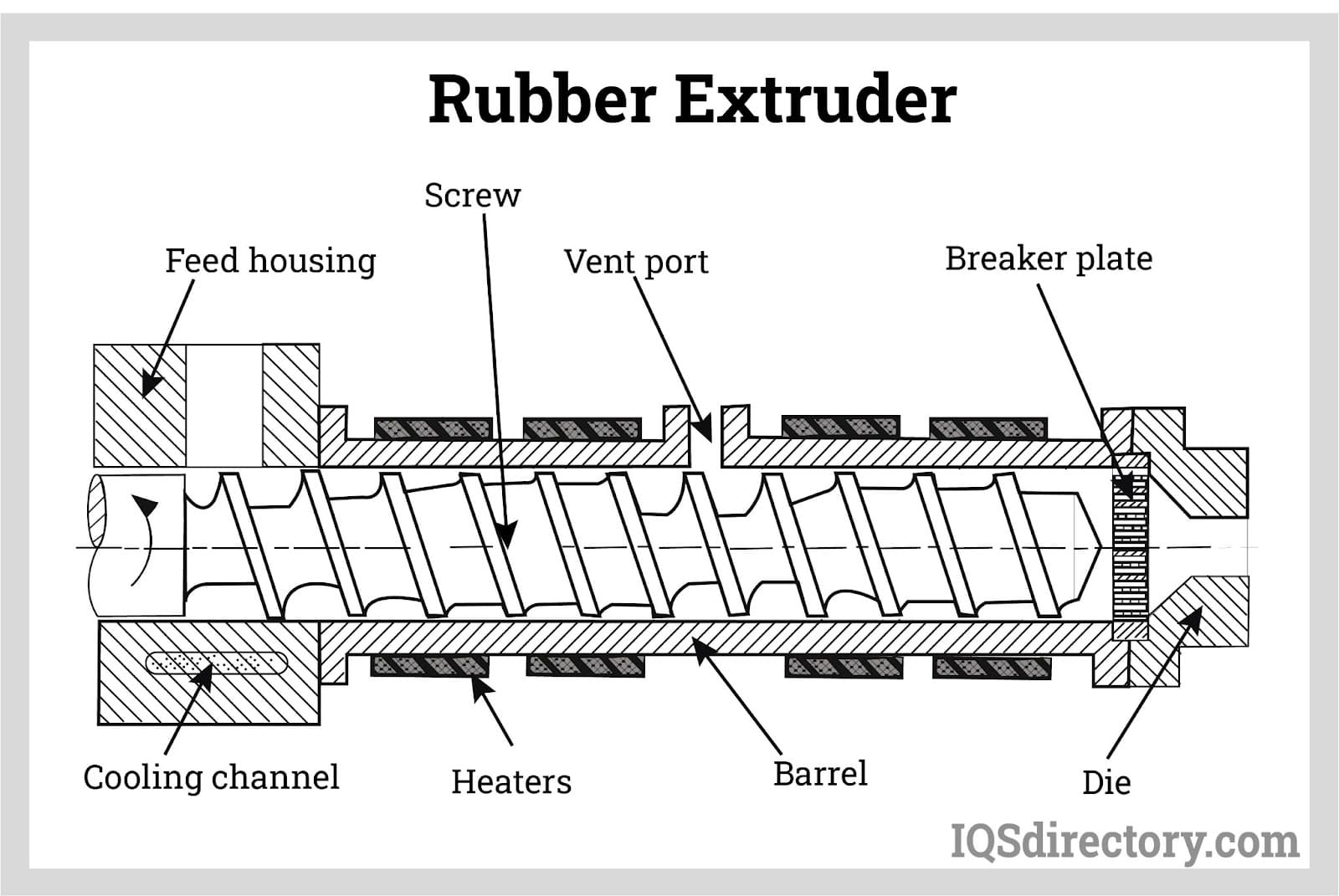 Rubber extrusion begins with raw rubber material (or stock) processed through a rubber extruder or a screw extruding machine.