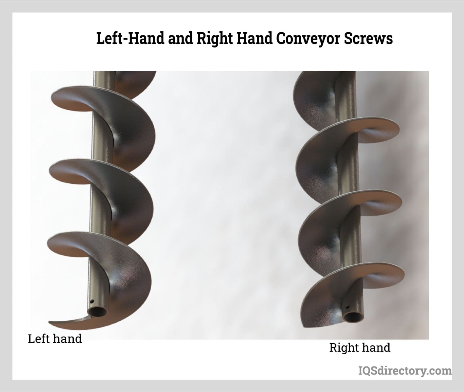 Screw conveyor handedness is determined by the end of the conveyor screw, turning clockwise are right-hand screw conveyors and counterclockwise are left-hand screw conveyors.