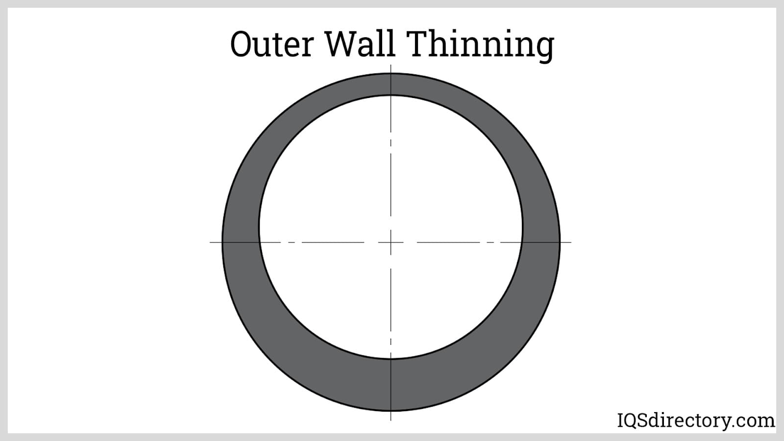 Outer wall thinning occurs when the tube’s outer curve is stretched, resulting in elongation and reduced wall thickness.